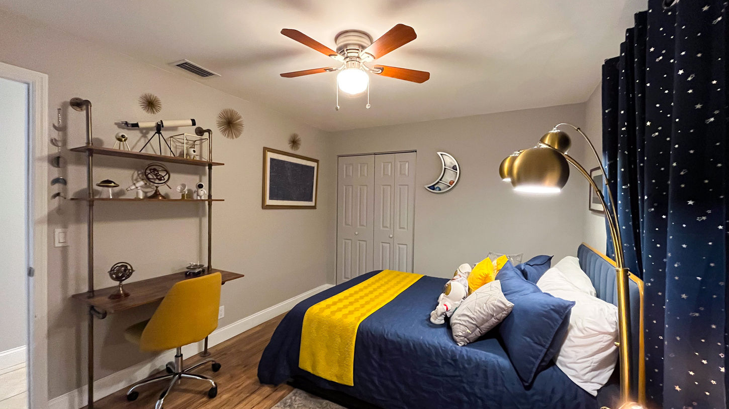 The Space Room at The SOFA House is a dreamy escape designed to feel truly out of this world. With a comfortable queen bed, celestial-inspired décor, and soft ambient lighting, this room invites you to relax and drift away in a calm, otherworldly atmosphere. This room is an ode to the homeowner who is an astronomy fan, and reflects our famous Space Coast! Sometimes rockets can be seen from Delray! This room has a blend of sophistication with a touch of cute, making it a great choice for kids or adults. This room has an optional folding floor mattress for a kid or teen.